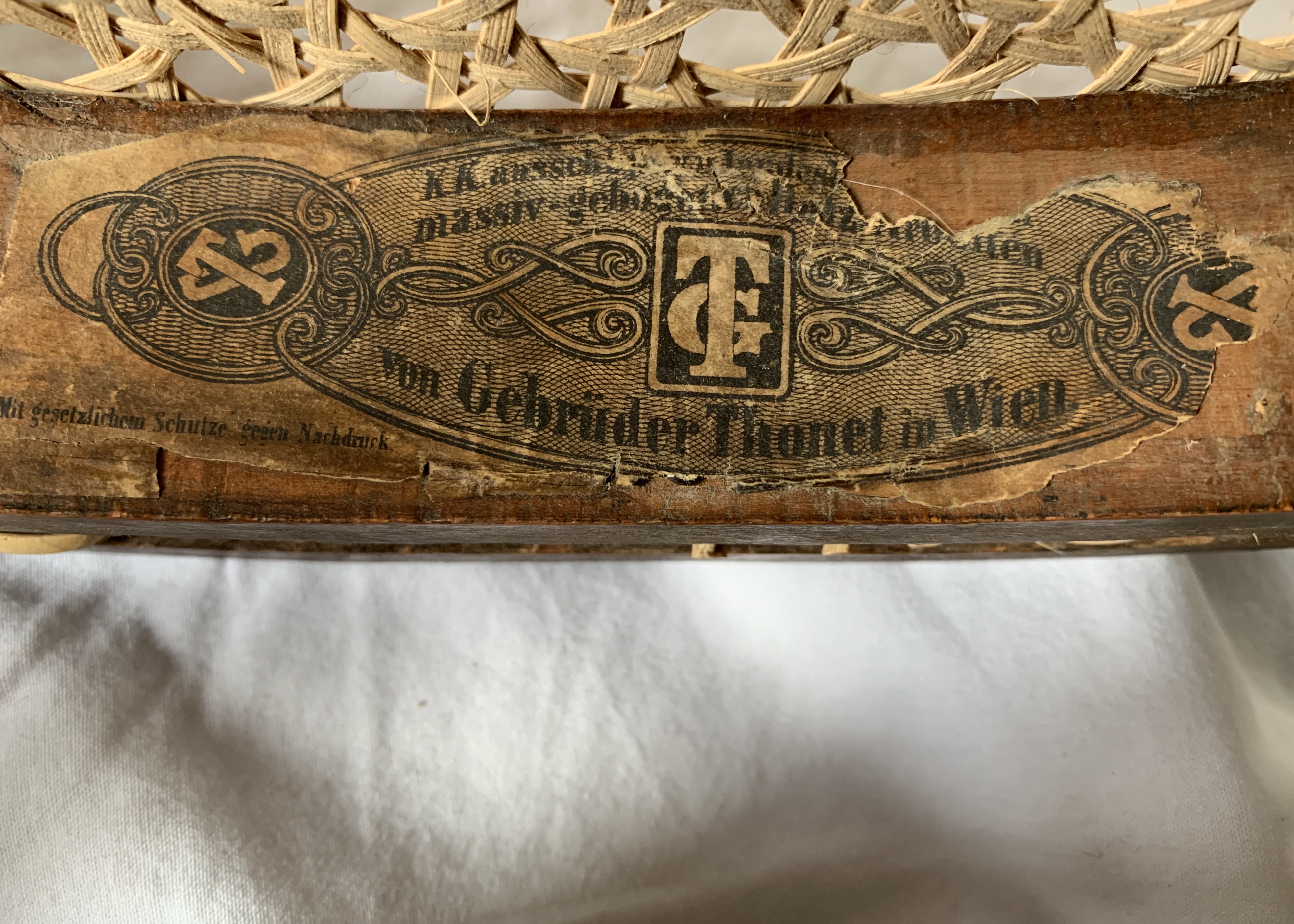 Glücklicherweise können wir bei Thonet nicht nur auf einen Fundus an original Katalogen zurückgreifen, sondern wurden dessen Sessel bereits seit den Tagen der frühen Produktion gekennzeichnet. Wenn ein Sessel also keine entsprechende Kennzeichnung aufweist, ist grundsätzlich davon auszugehen, dass es sich um keinen echten Thonet handelt. Es kann aber natürlich sein, dass sich im Laufe der Zeit z.B. die Papierschutzmarke gelöst hat, oder ein Stempel überrestauriert wurde. Auch bei sehr frühen, noch schichtverleimten Stücken, kann eine Kennzeichnung fehlen. In diesen Fällen helfen einige andere Merkmale um ein Original zu identifizieren.